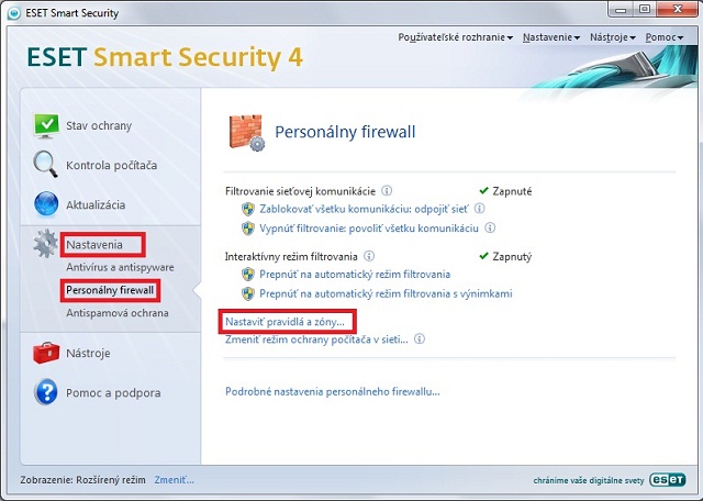 Opäť si otvoríme Menu-Nastavenia-Personálny firewall-Nastaviť pravidla a zóny.