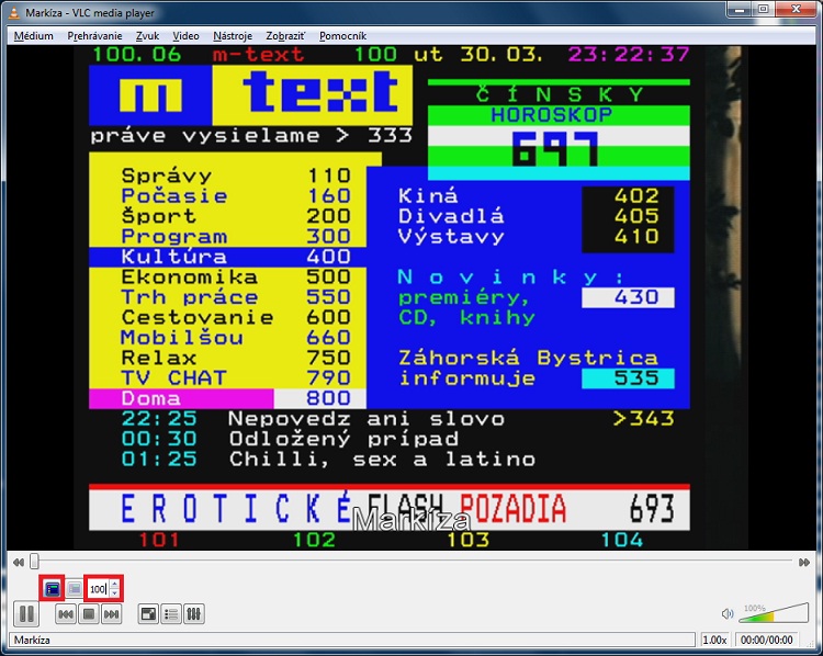 Vo vlc môžeme pozerať aj teletext, ak ho daná televízia vysiela. Klikneme vľavo dole na ikonu a vpravo zadáme číslo teletextovej stránky.