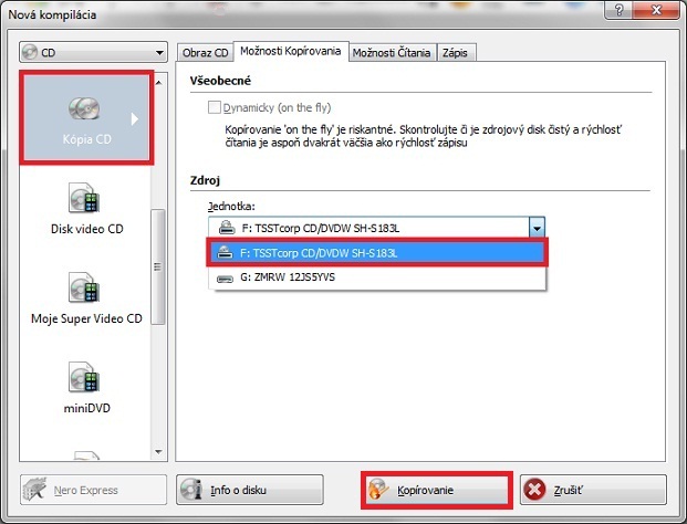 Vyberieme si z ktorej optickej mechaniky Nám ma kopírovať optické medium /cd, dvd/.