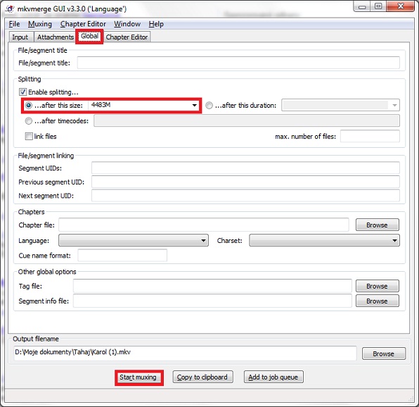 Rozdelenie mkv na viac Dvd-R/4.38 GB/. Klikneme Global-enable splitting 4483 M. Klikneme Start Muxing a po dokončení klikneme na ikonku OK.